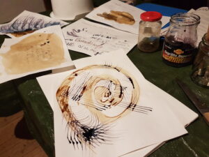 Monatlicher Kreativtreff des Künstler*innenkollektivs Tusche und Tinte, Bayreuth. Impulsgeberin des Abends: Gabi Wenz